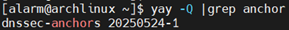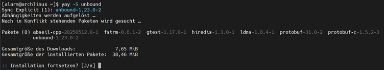 Unbound installieren wir mit yay. Die Abhängigkeiten werden automatisch mit installiert. dnssec-anchors war bereits installiert: